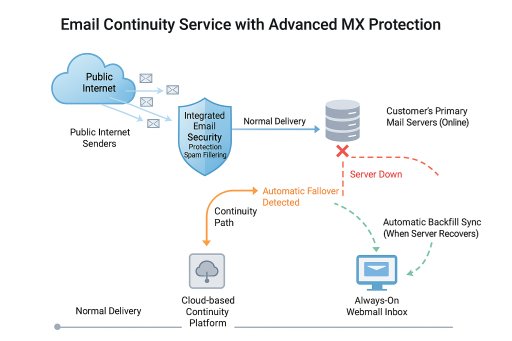 During a disruption, inbound email flows into our cloud continuity platform. Users log into a secure webmail inbox to continue business as usual. Once the primary server recovers, all messages and activity synchronize back automatically.